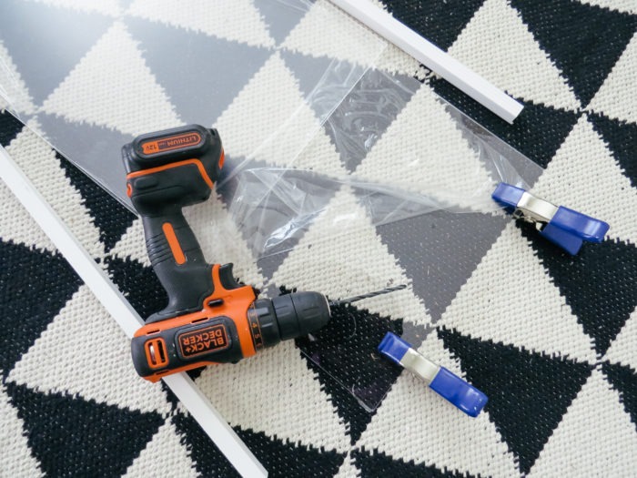 Measure handles and then use drill in backwards mode to drill holes. Use clamps to keep drill aligned with 2 sheets of Plexiglas. You will drill holes in both pieces at the same time.