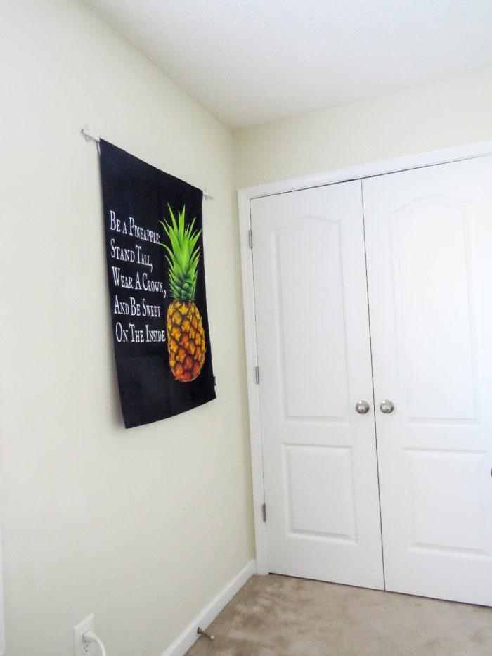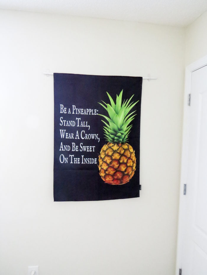 My home office is where I like to display motivational and inspirational messages. It helps me stay positive even when I feel discouraged or lack inspiration. I looked for many ways to display this quote. In the process I discovered Flagology. Flagology is a site that lets you create custom flags and doormats for your home. The process is simple and there are many options that you can select from. You can even include your own personal photo or use clip art. I selected to use a pineapple clip art for my pineapple wall decor.