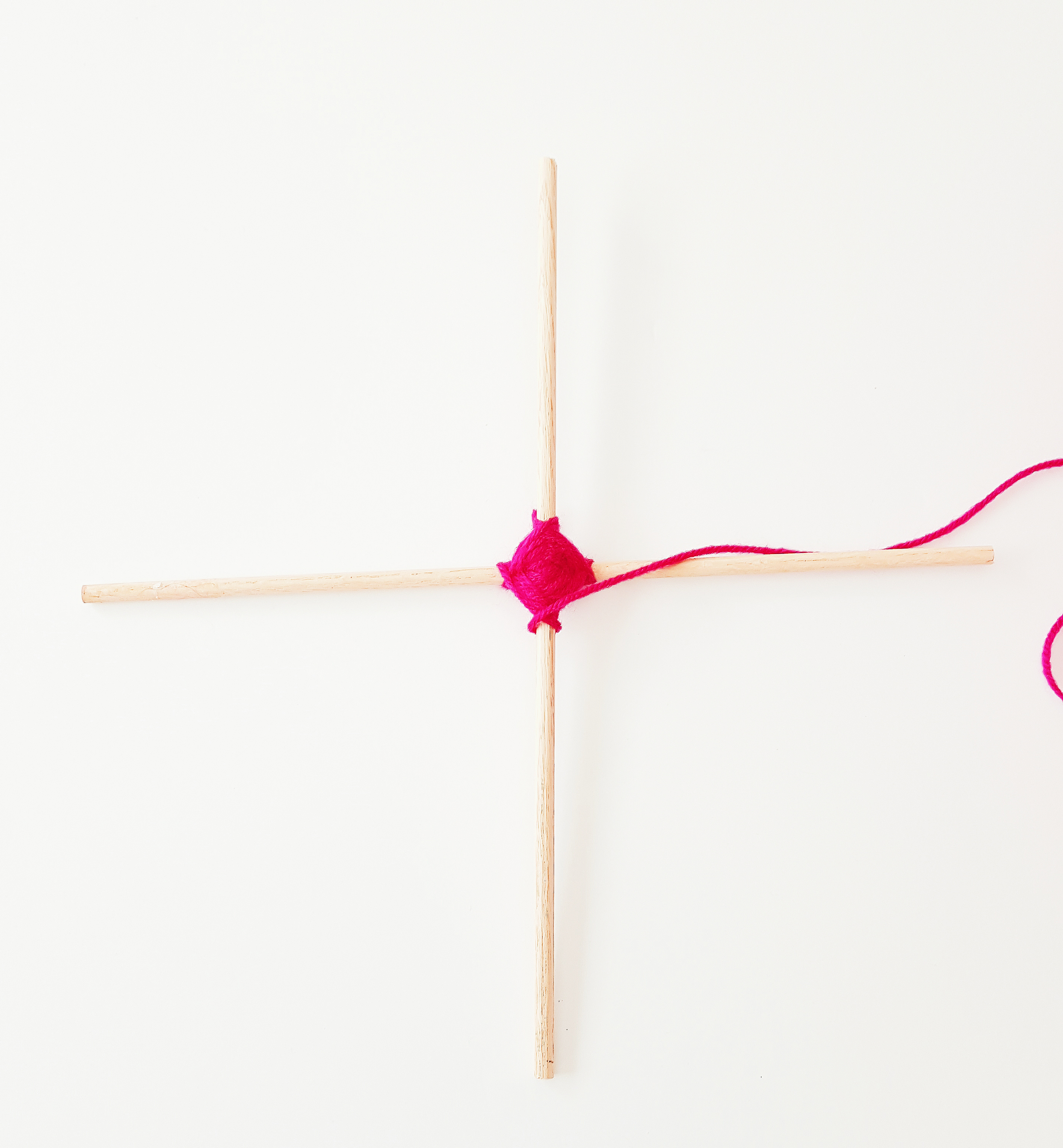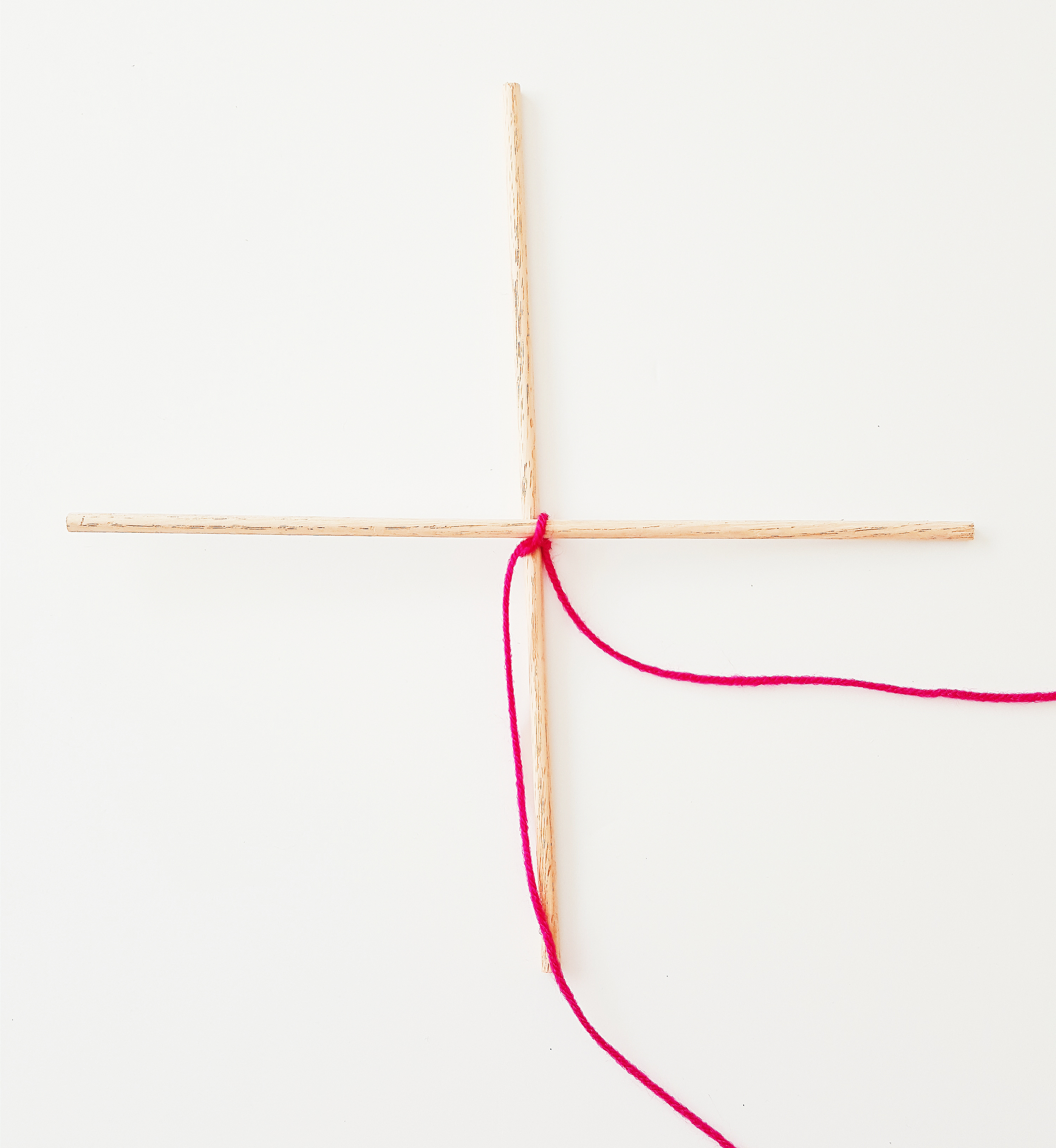 - Cross the two wooden doles and then begin to wrap with a piece of yarn until secure.