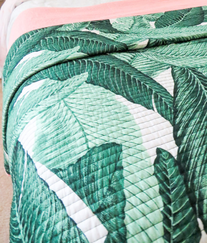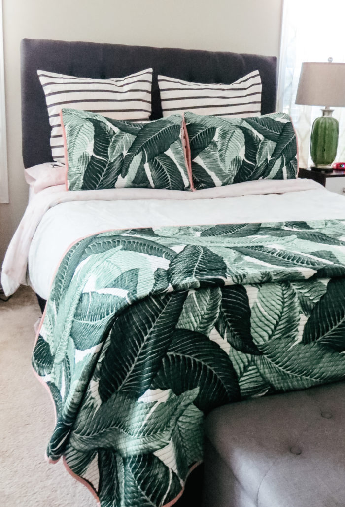 Target does it again with this banana leaf bedding set. It’s a set that you might not find easily on the Target website. It was hidden in the back to school section in my local Target. It caught my eye, and I knew that it would be perfect to refresh my master bedroom. I know it’s not very fall or winter like, but it’s my style either way.